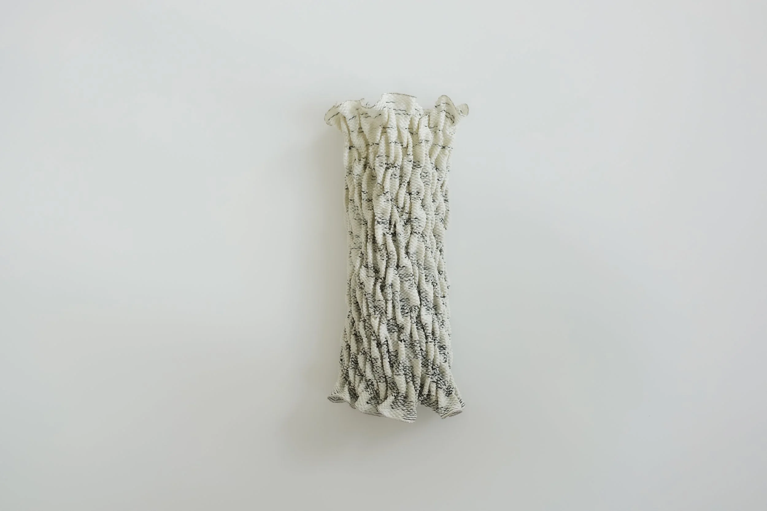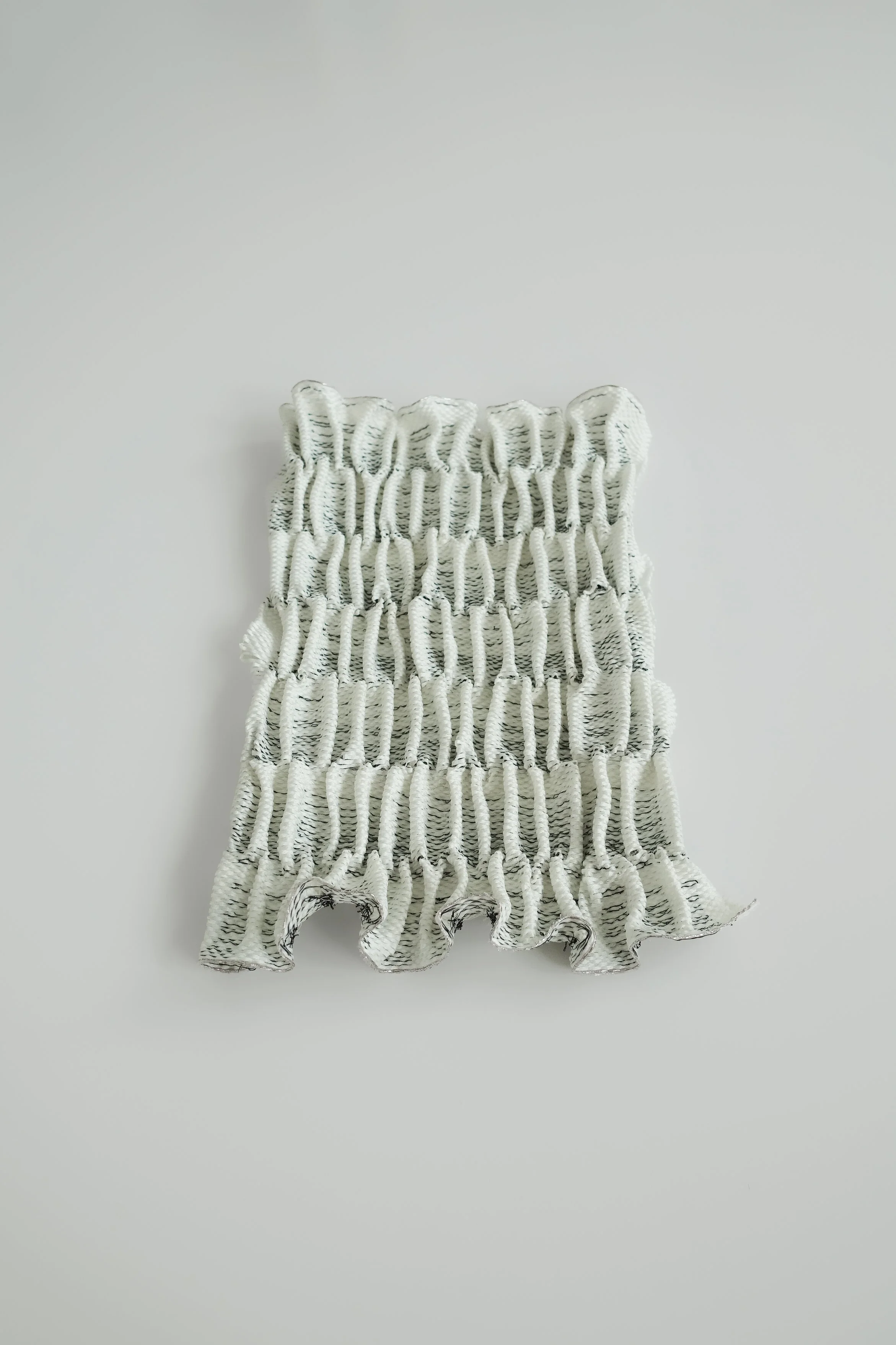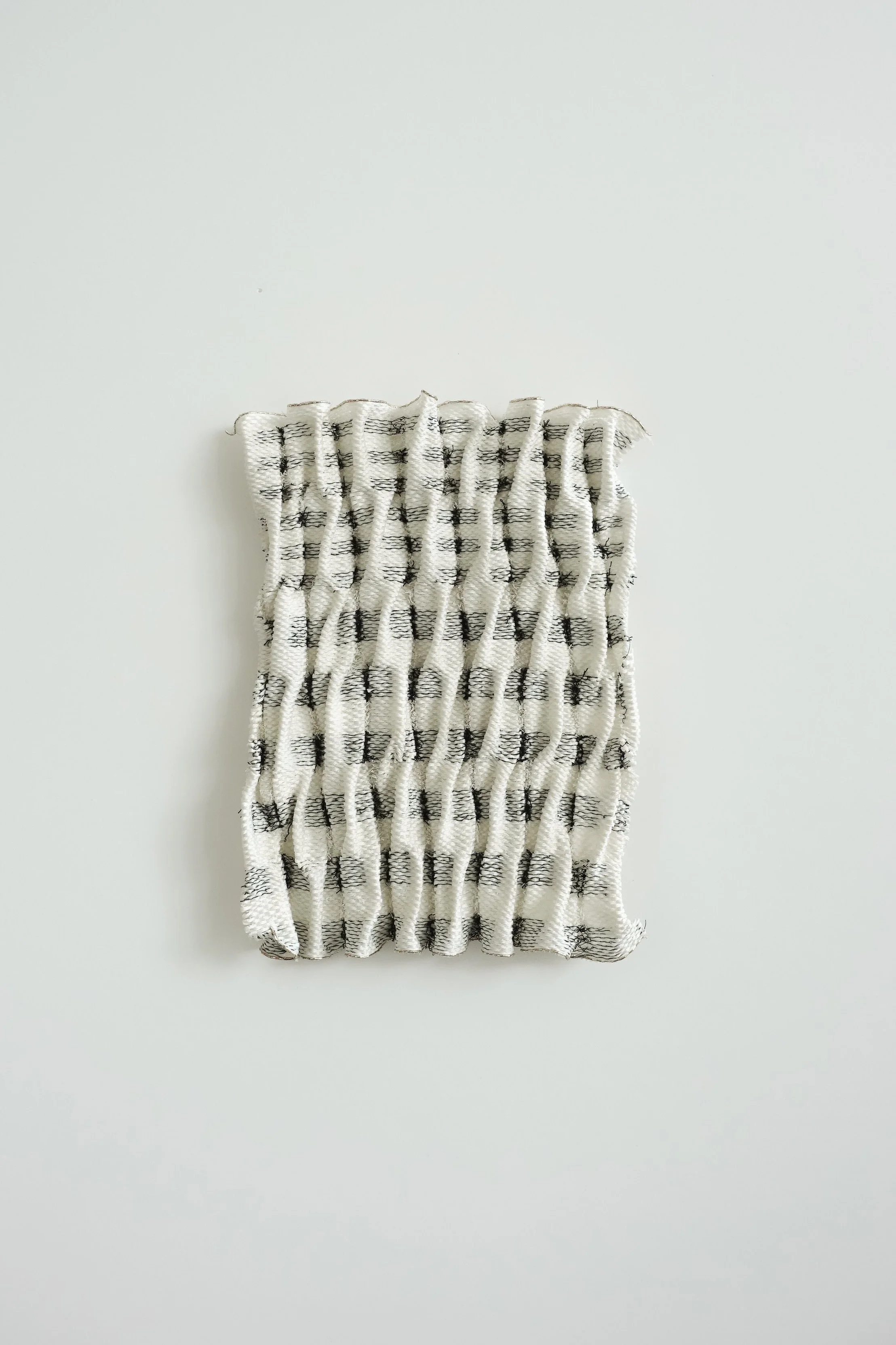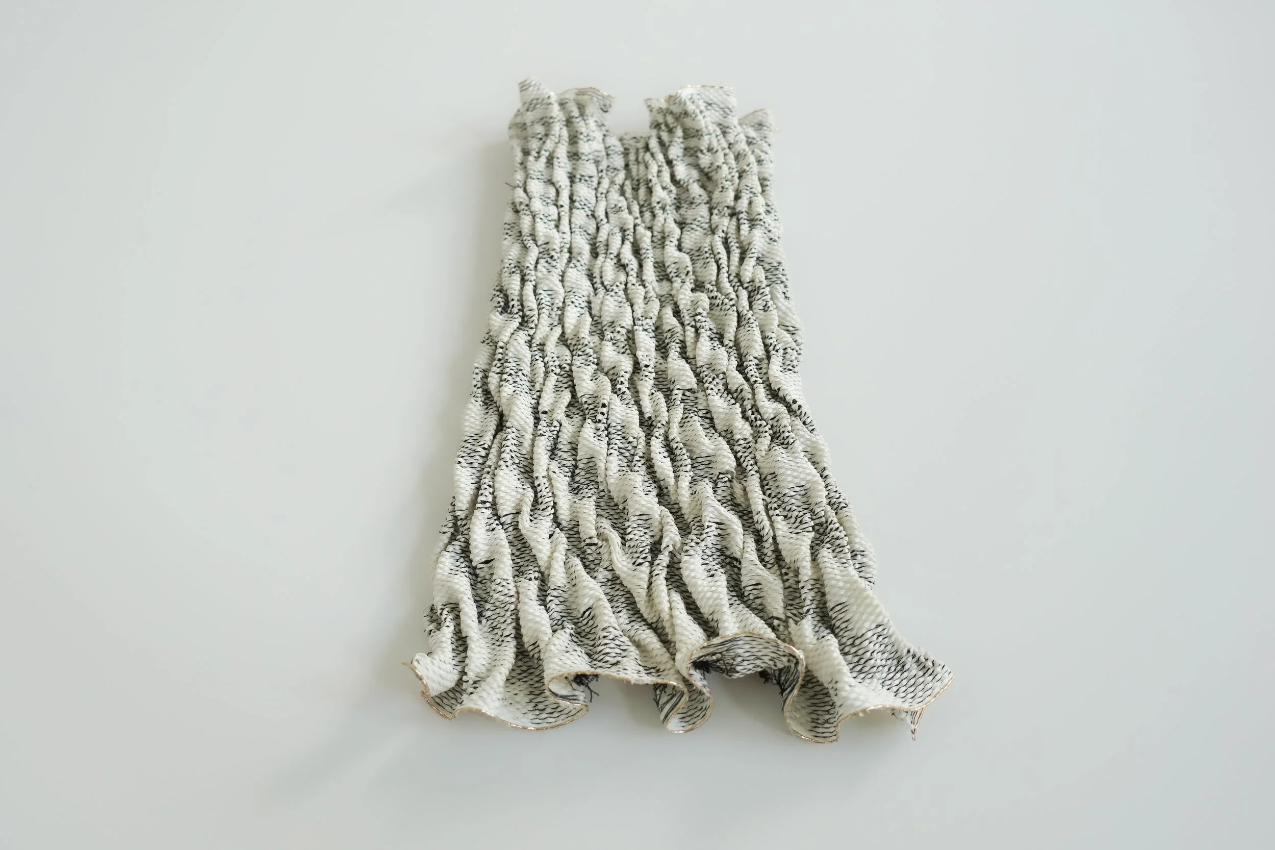 EMBEDDED FORM is a series of hand‑woven textiles that begin as two‑dimensional surfaces and evolve into sculptural, three‑dimensional forms. Silk crepe is integrated into the weave structure to introduce patterns that guide the transformation. Upon removal from the loom, the material continues to independently shape towards its final form, determined by the embedded patterns that serve as DNA.