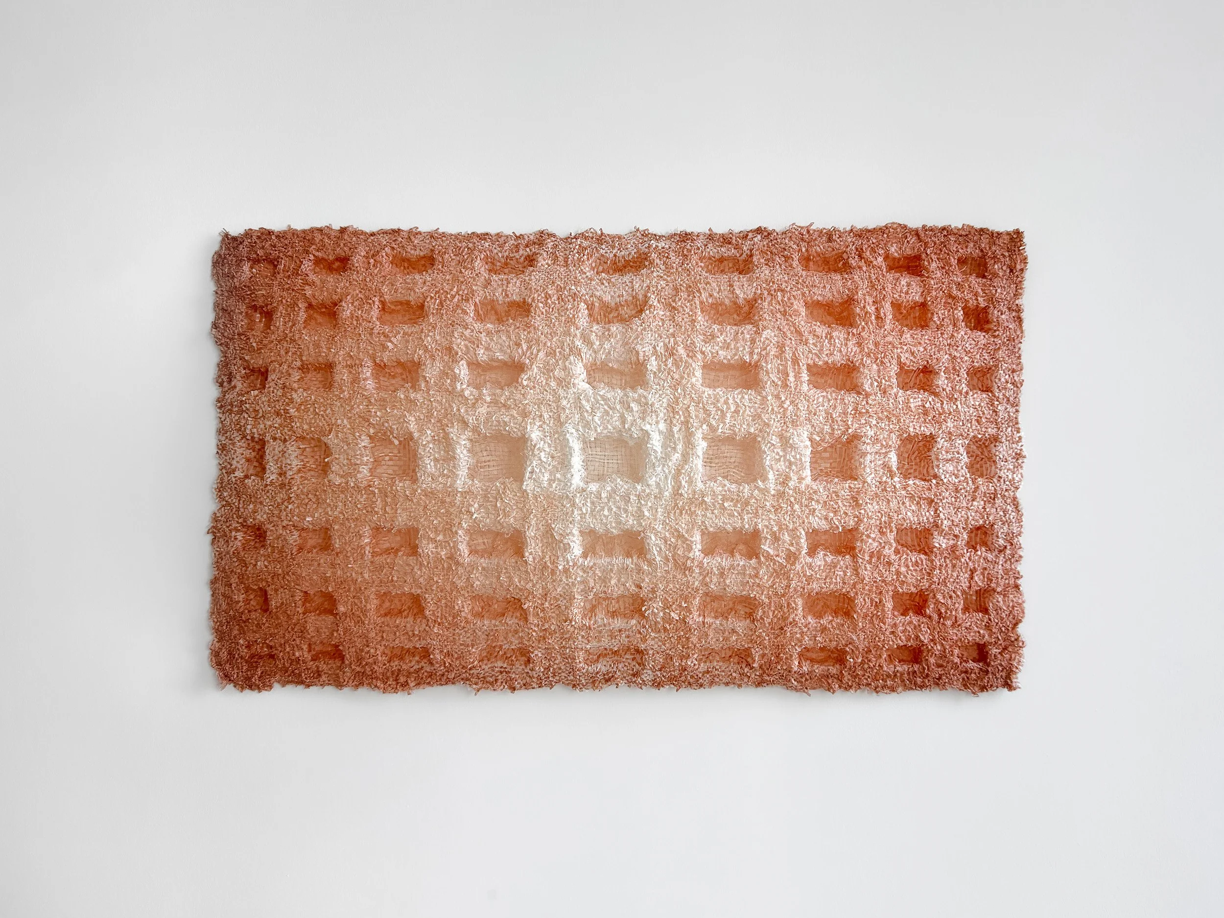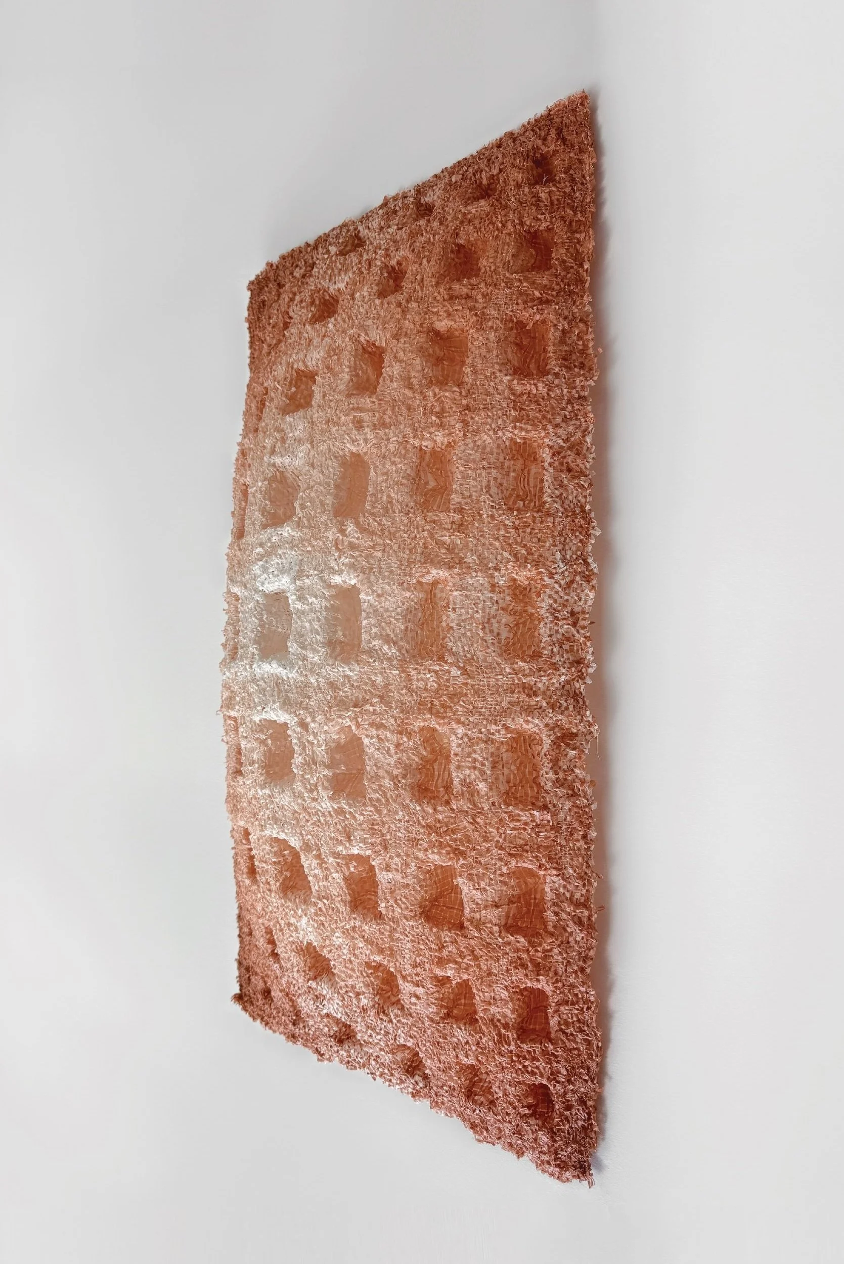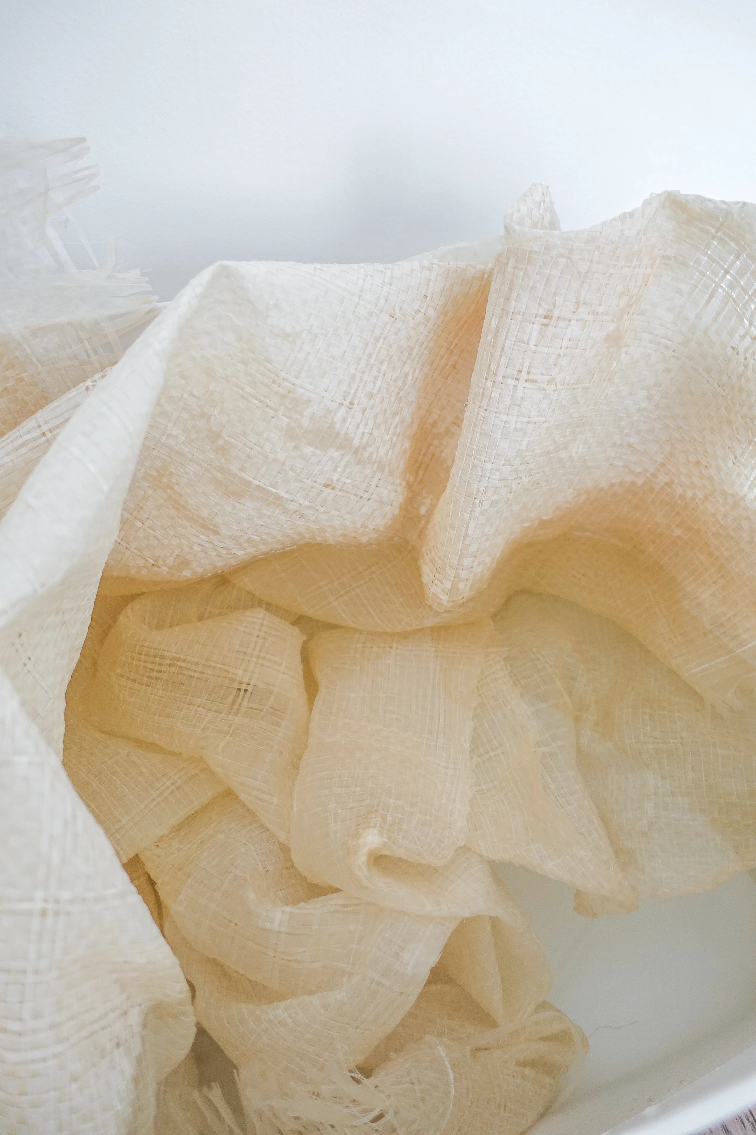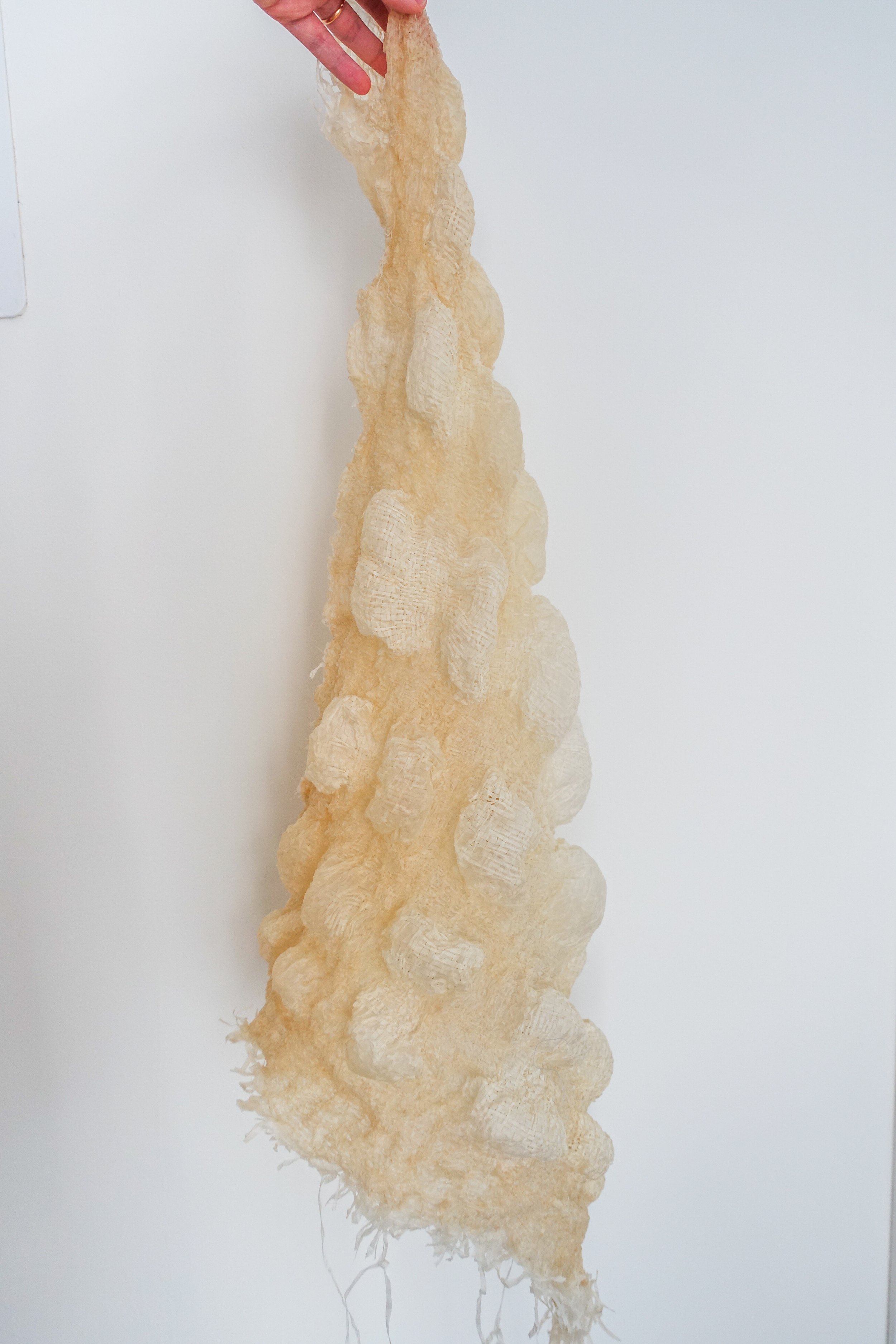 PROGRAMMED PAPER explores how weaving patterns define a three-dimensional structure. Paper becomes malleable with moisture. I utilize this property of the fibre and further incorporate silk crepe during weaving to form patterns. When exposed to moisture, the hybrid weave naturally folds into a three-dimensional form according to how the silk crepe is integrated. These weaving patterns “program” material behavior into the fabric structure. The pattern of programmable paper can be controlled, but these sculptures also have an unpredictable nature that arises organically when moisture is introduced. While wet, the hybrid weave remains malleable and open to manipulation. Once dried, the structure takes on a permanent form.