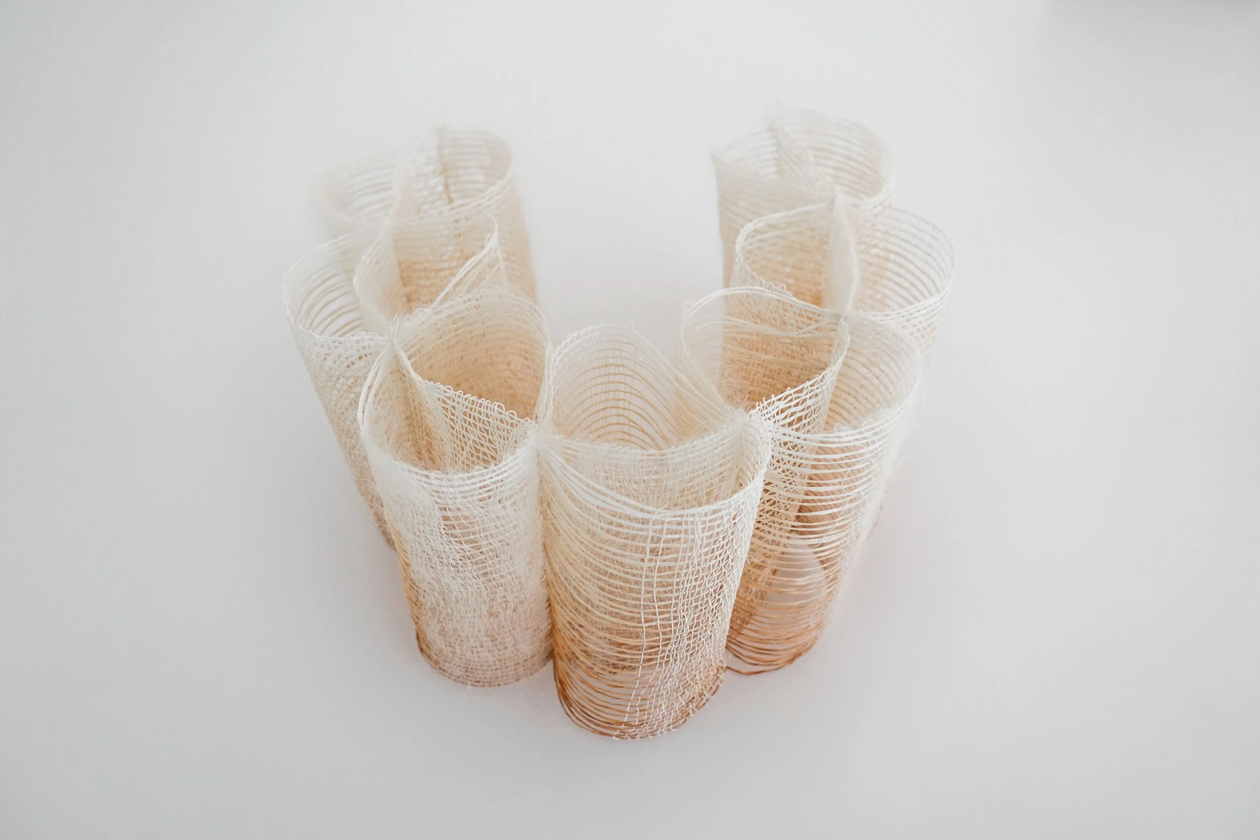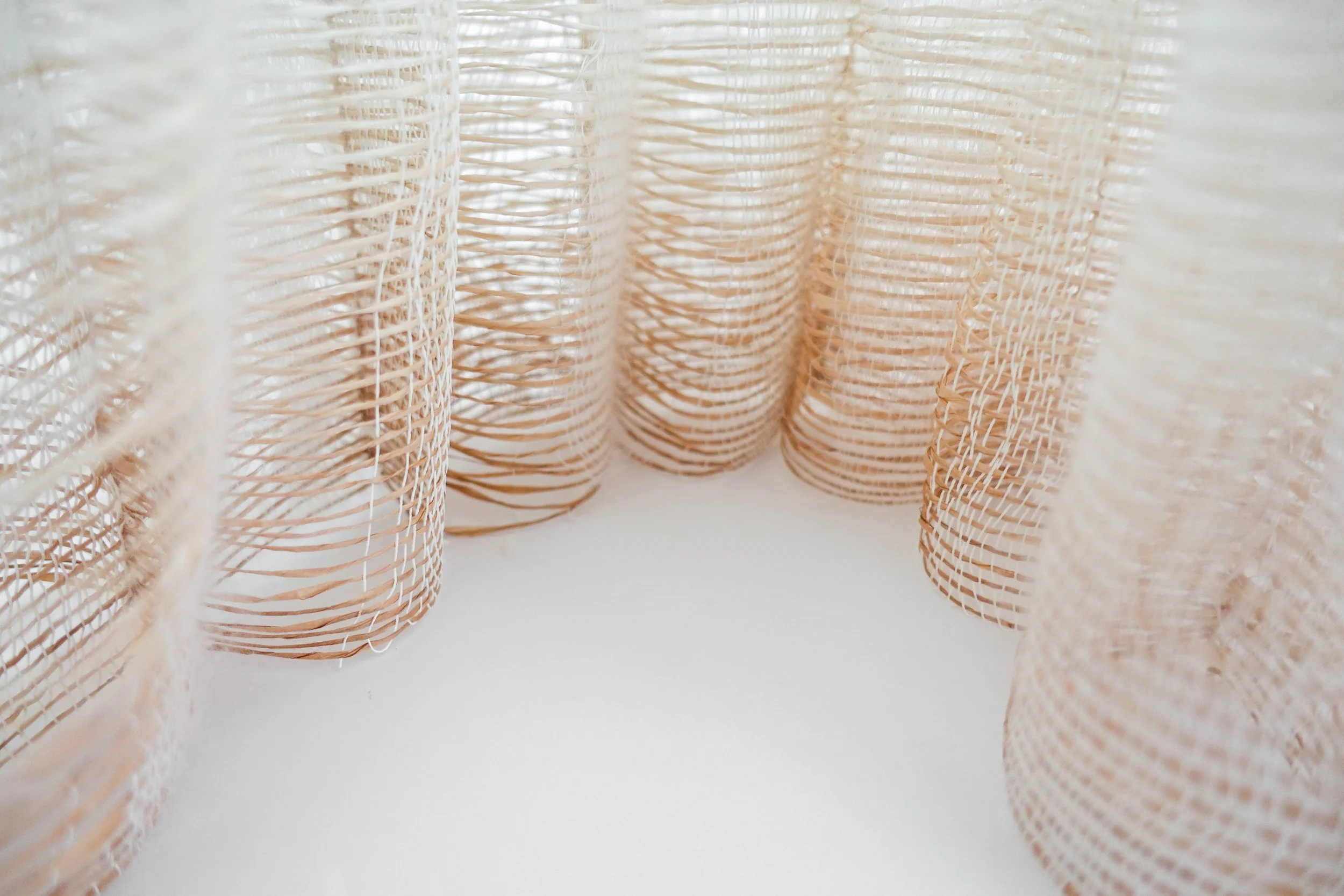 DOUBLE-WEAVE OBJECTS is a series that explores materials and layers. The structure of the woven pieces are built with triple weaving technique. Material quality is never assessed in isolation. Here, different yarns are incorporated to see how one material sits in relation to another. Looking at layered object makes our senses react with curiosity and doubt, it’s an invitation to penetrate the layers with our eyes.